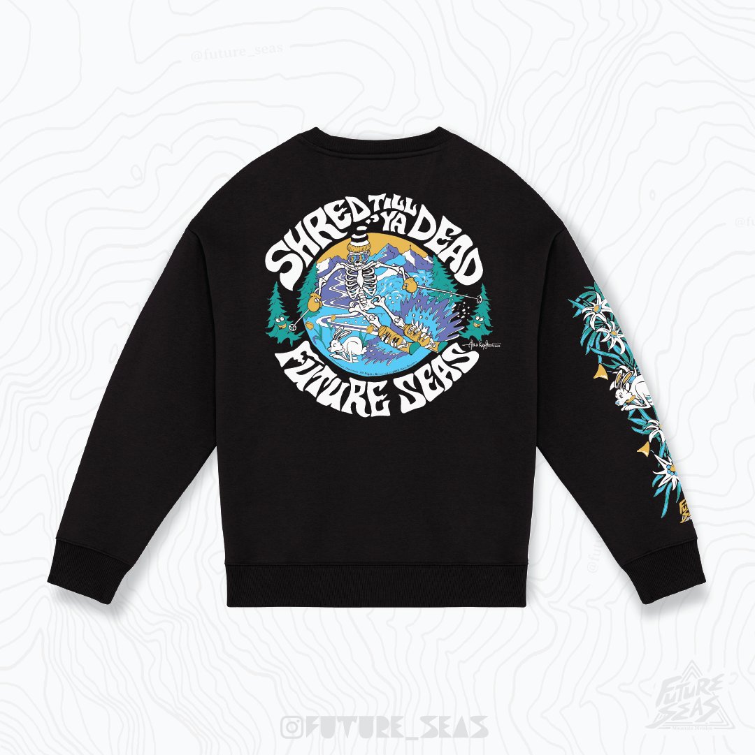 After heavy demand we're bringing back the Future Seas Shred Till you Dead Vitosha Mountain shred sweatshirt.